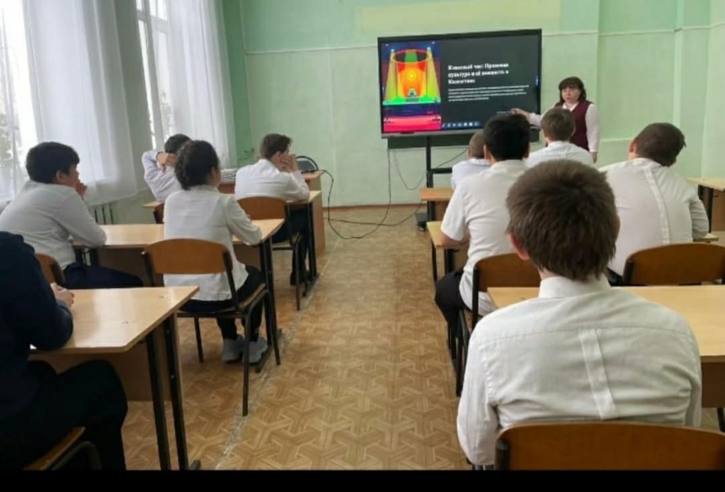 12 қаңтарда мектепте 6-9 сынып оқушылары арасында "құқықтық мәдениет және оның маңыздылығы"тақырыбында бірыңғай сынып сағаты өтті.