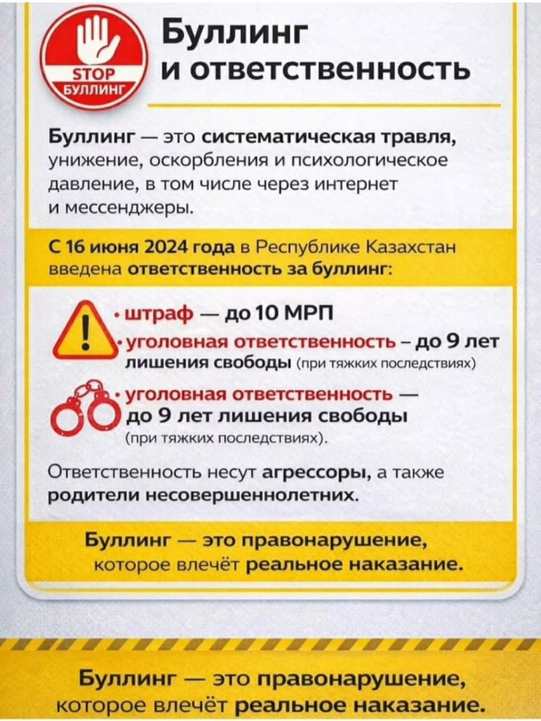 Қазақстан Республикасының Білім беру ұйымдарында буллинг және кибербуллинг жағдайлары, оның ішінде интернет - ресурстар және мессенджерлер (Telegram-чаттар) арқылы анықталады. Мұндай топтарда кемсітушілік, топтық қорлау және психологиялық қысым белгілері бар, көбінесе...